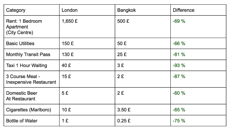 Tech in Paradise founders are both from London, and have a first hand experience with making a transition to living and working in Bangkok. For this reason we have compared London vs. Bangkok’s cost of living below* to demonstrate how big of a difference a move to Bangkok could mean for your savings.